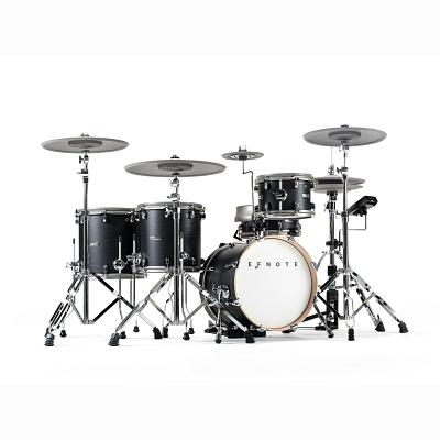 Das 5-teilige EFNOTE 5X setzt mit seinem exzellenten Klang, der Multi Trigger Technologie und dem Akustik Drum Design neue Maßstäbe. Für den überragend naturgetreuen Sound sorgen aufwendig produzierte Multilayer Samples. Jeder der 98 Werkssounds besteht aus einer Vielzahl von Einzelsamples, wodurch eine außergewöhnlich hohe Dynamik und ein naturgetreues Klangverhalten erreicht wird. Das kompakte Sound Modul hat ein stabiles Metallgehäuse und wird über ein Touch Screen LC-Display bedient. Mit seinem übersichtlich strukturierten Menü ist selbst ungeübten Nutzern ein schneller Zugriff auf alle Funktionen und Einstellungen möglich. Alle Sounds lassen sich durch Funktionen wie stimmen (Tuning), abdämpfen (Muffling) und klangregeln (EQ) den eigenen Vorstellungen entsprechend editieren und im User-Speicher ablegen. Insgesamt stehen dafür 128 Speicherplätze zur Verfügung. Außerdem hat man ein virtuelles Mischpult, über das sich die Sounds individuell in der Lautstärke regeln und beliebig auf die Ausgänge routen lassen. Das integrierte Metronom und die Rhythm Box sind ideal zum Üben. Außerdem können Songs und Play-Alongs über Bluetooth ins Modul gestreamt werden. Das EFNOTE 5 Modul ist auch mit einem USB Audio Interface ausgestattet, über das 8 Spuren digital zum Rechner übertragen werden können. Zusätzlich sind bis zu vier 4 Analog-Ausgänge nutzbar. Das EFNOTE 5X eignet sich gleichermaßen für den Live- und den Studiobetrieb sowie für Unterrichtszwecke. Die Bass Drum, Snare und die Toms sind aus hochwertigen, 6-lagigen Birkenkesseln gefertigt und mit doppellagigen Mesh Heads bespannt. Um eine einmalig hohe Sensibilität und äußerst präzise Ansprache zu gewährleisten, verfügen alle Toms und die Snare über insgesamt 3 Trigger-Sensoren. Zusätzlich verfügt die Snare über eine dritte Spielfläche. Dies ermöglicht eine 100% genaue Trennung zwischen Cross Stick und Rim Shot. Ein fehlerhaftes Auslösen der Trigger ist somit absolut ausgeschlossen. Die 16“ Bass Drum ist mit 2 Triggern bestückt und gewährleistet damit eine immer gleichbleibende Ansprache, ganz gleich ob eine Einzel- oder Doppelfußmaschine eingesetzt wird. Alle Cymbal Pads, auch die Hi-Hat, sind um 360° von allen Seiten bespielbar und über einen Choke Sensor abstoppbar. Somit ist eine Vorrichtung, welche das Verdrehen der Becken verhindert, nicht mehr notwendig. Bei den Crash und Ride Cymbals handelt es sich generell um Triple Zone Pads, bei denen sowohl der Rand, die Fläche als auch die Glocke bespielt werden können. Die Hi-Hat verfügt durch die optischen Multi Trigger Sensoren über eine außergewöhnlich feine Abtastrate und ein äußerst präzises Spielverhalten. Dadurch werden auch komplexe Spielfiguren mit hohen Geschwindigkeiten problemlos umgesetzt. Zu guter Letzt wird der große Dynamikbereich sowie die konsistente und stabile Abtastung bei einer absolut niedrigen Latenzzeit durch den neu entwickelten ELISE-Sensorprozessor umgesetzt.