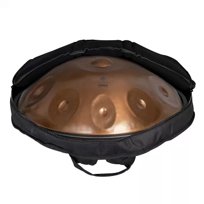 Jede Sela Handpan wird mit einer Tasche aus reißfestem Nylongewebe ausgeliefert, die dank ihrer guten Fütterung für optimalen Schutz beim Transport sorgt. Sie lässt sich wahlweise mit Hilfe der zwei Griffe per Hand oder durch verstellbare Schultergurte auch komfortabel als Rucksack tragen. Ein praktisches Außenfach bietet genug Platz für kleine Zubehörartikel wie ein Metronom.