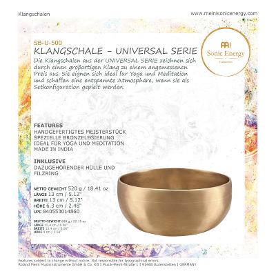 Die Klangschalen aus der UNIVERSAL SERIE zeichnen sich durch einen großartigen Klang zu einem angemessenen Preis aus. Sie eigenen sich ideal für Yoga und Meditation und schaffen eine entspannte Atmosphäre wenn sie als Setkonfiguration gespielt werden.