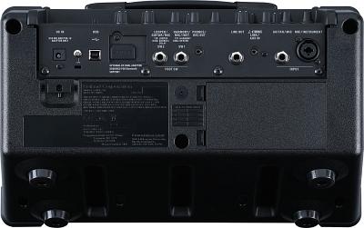 - Gitarren-/Mikrofonkanal mit neun Verstärkertypen, 3-Band EQ, Chorus/Delay, Reverb und Tuner