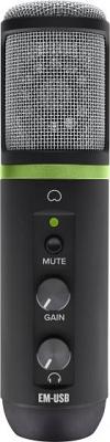 Das Mackie EM-USB ist ein Kondensatormikrofon mit USB-Anschluss für das einfache Aufnehmen von Sprache , Gesang oder akustischen Instrumenten am Computer. Das Mikrofon eignet sich vorzüglich für Podcaster , Journalisten und Youtuber , aber auch für den privaten Gebrauch z.B. für Videotelefonie . Mit dem Lautstärkeregler kann der Pegel des Mikrofons leicht an die Aufnahmesoftware Ihrer Wahl angepasst werden und über den Kopfhörerausgang können Sie das Aufnahmesignal direkt und ohne Latenz abhören. In einer Aufnahmepause kann das Mackie EM-USB mit dem Mute - Schalter stummgeschaltet werden.
