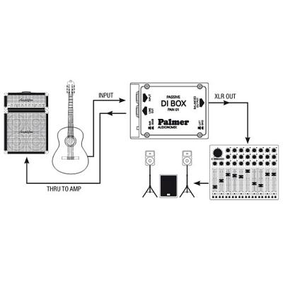 Passive DI-Box. Klinkeneingang mit parallelem Ausgang zum Durchschleifen des Signals. Trafosymmetrischer XLR-Ausgang. Eingangsempfindlichkeit schaltbar. Es können Line- und Lautsprechersignalpegel verarbeitet werden.